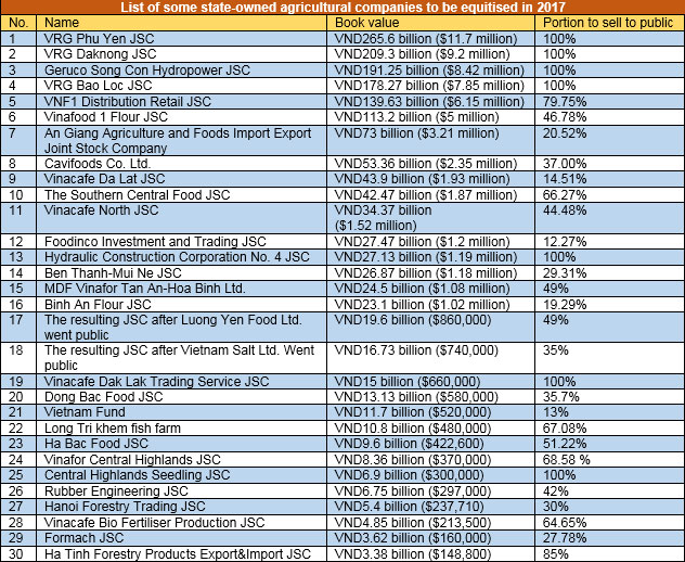In total, in the 2017-2020 period, the government is going to sell VND2.19 trillion ($96.4 million) worth of agricultural company stakes at book value. Only in 2017, the figure is projected at VND1.643 trillion ($72.3 million).