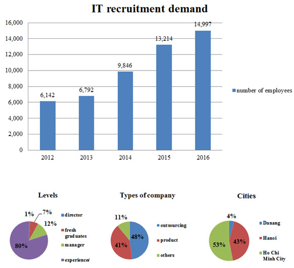 According to the latest report by VietnamWorks on the Vietnamese IT sector in 2017, manpower demand hit an unprecedented peak with roughly 15,000 job postings in 2016. As predicted by VietnamWorks, given that 80,000 IT employees will graduate from school in 2017-2018, Vietnam is projected to face a critical manpower shortage of 70,000 IT staff.