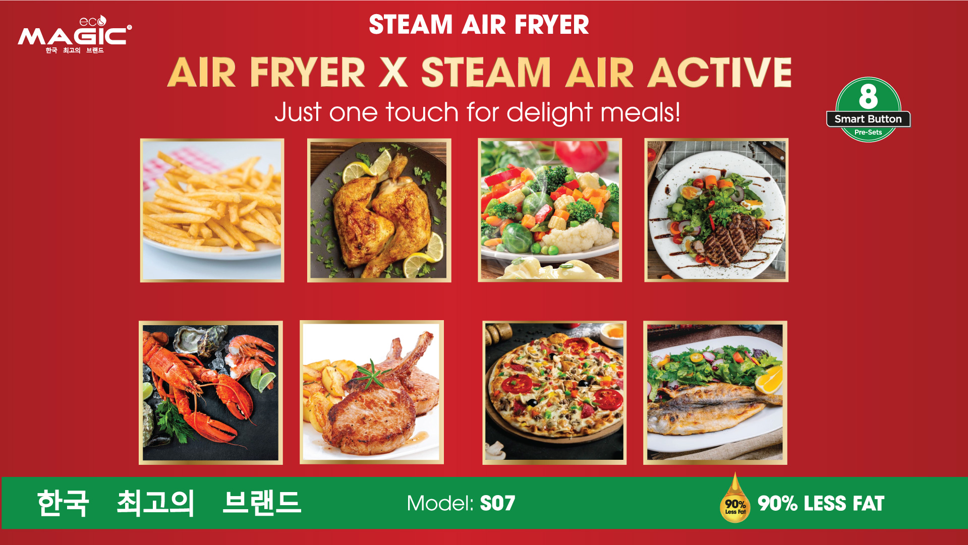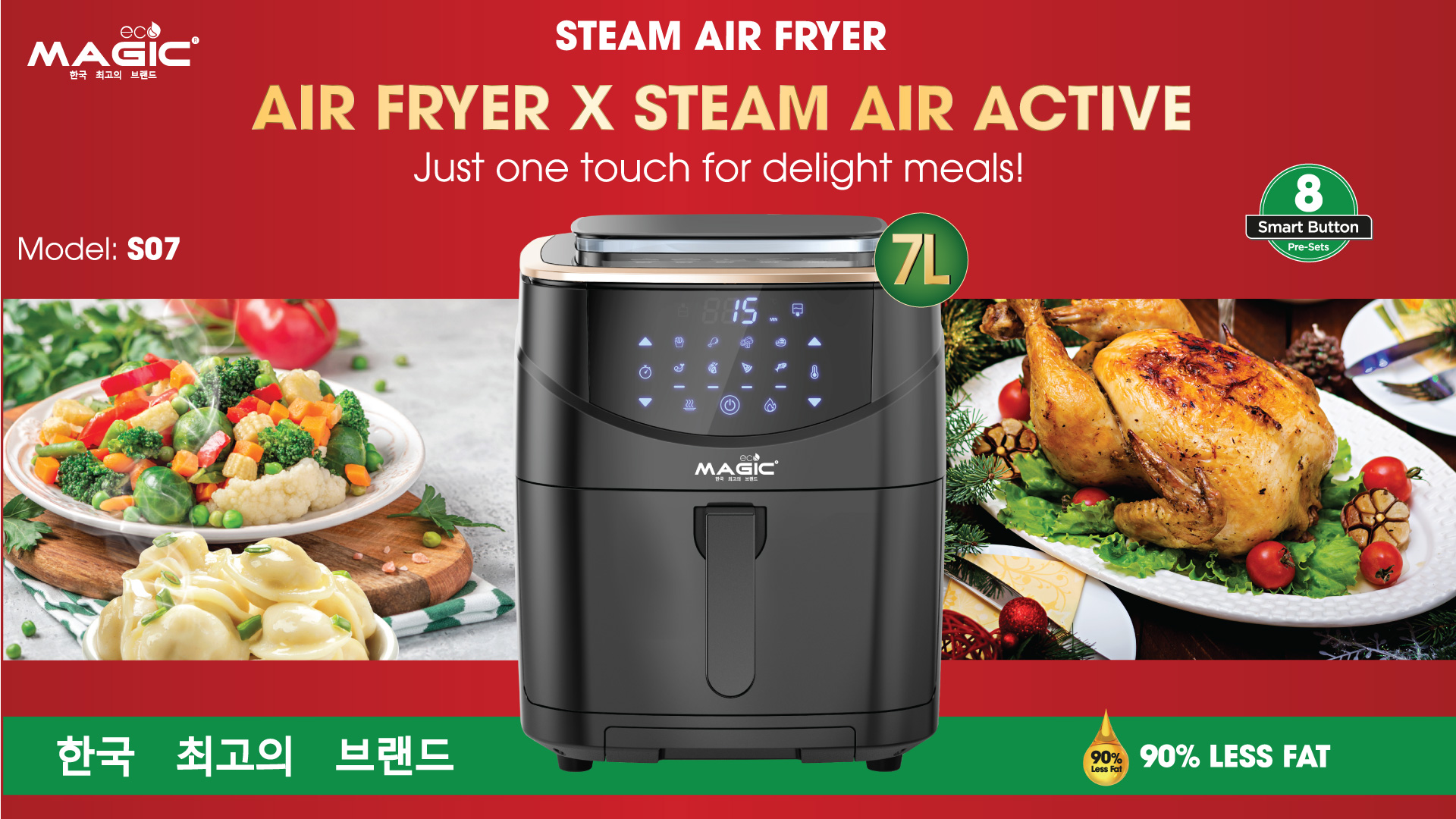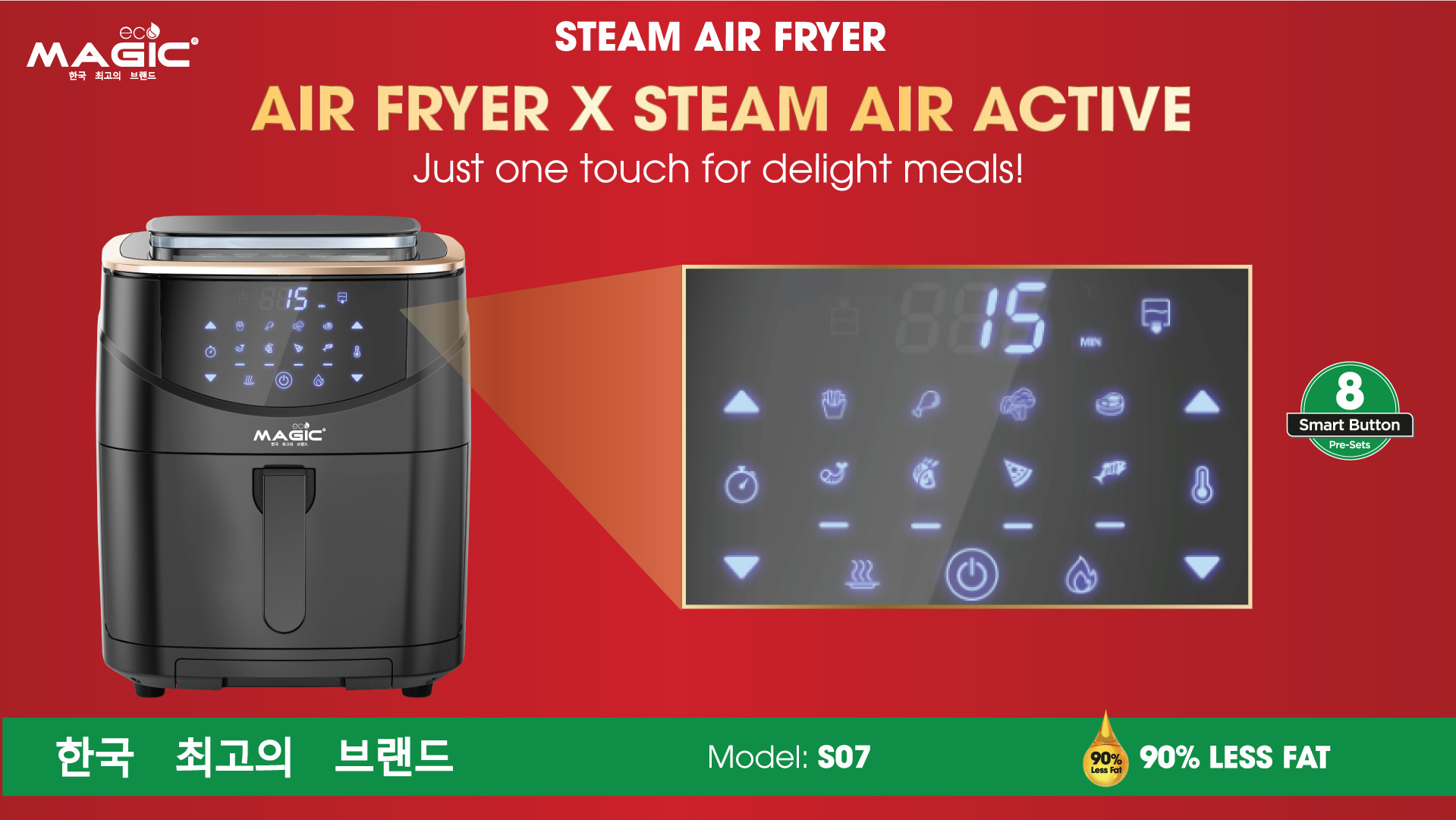 Nồi chiên không dầu kết hợp hấp Magic Eco S07 là bước ngoặc lớn trong công cuộc nấu ăn của nhiều chị em nội trợ. Đột phá thiết kế khi kết hợp cả hai công nghệ Chiên – Hấp trong cùng một sản phẩm. Công nghệ Rapid Air giúp giảm 90% lượng dầu mỡ, Công nghệ hấp Steam Air Active giúp cho các món hấp chín đều, căng mọng nước, giữ được trọn vẹn dưỡng chất bên trong thực phẩm cho hương vị đậm đà hơn. Chỉ với 1 chạm đơn giản bạn đã có ngay một bàn đồ ăn thơm ngon để chiêu đãi cả nhà, sử dụng đơn giản và tiết kiệm thời gian tối ưu.