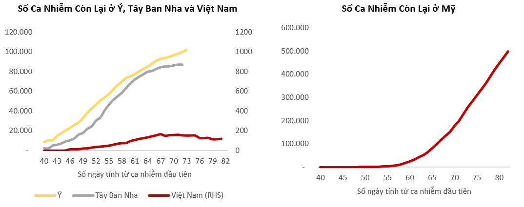 Cuối cùng, hầu hết các chính phủ đang hiệu chỉnh các biện pháp mở cửa lại kinh tế, dựa trên tốc độ giảm của số ca nhiễm COVID-19 còn lại và/hoặc số ca tử vong tính từ đỉnh (ví dụ, mức tăng đột biến trong các ca nhiễm COVID-19 còn lại của Ý trong biểu đồ trên, và tốc độ giảm dần sau đó là chỉ báo quan trọng cho những quyết định của các chính trị gia và giới chức y tế của Ý). Vì giới chức y tế của Việt Nam đã "làm phẳng đường cong" và vì Việt Nam chưa có trường hợp tử vong nào, chúng tôi hy vọng việc mở cửa lại kinh tế của Việt Nam sẽ diễn ra khá suôn sẻ.