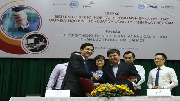 Công ty PwC Việt Nam và Trường Đại học Kinh tế - Luật Tp. HCM vừa ký biên bản ghi nhớ tăng cường hợp tác về hướng nghiệp và ứng dụng công nghệ, kết quả nghiên cứu khoa học nhằm nâng cao chất lượng chuyên môn cho sinh viên của trường.