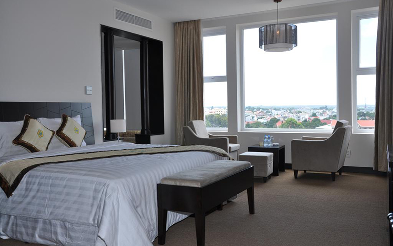 Với lối kiến trúc Tây Nguyên là sự giao thoa của kiến trúc hiện đại và gam màu văn hóa địa phương độc đáo, nội thất lưu trú đầy đủ tiện nghi trong 131 phòng ngủ được kết hợp tinh tế, trau chuốt đến từng chi tiết. Bên cạnh đó, nội thất lưu trú đầy đủ tiện nghi góp phần tạo nên không gian hoàn hảo cho bất kỳ loại phòng nào mà Quý khách lựa chọn, chắc chắn sẽ đem lại những trải nghiệm khó quên của Quý khách hàng trong thời gian lưu trú tại Khách sạn.
