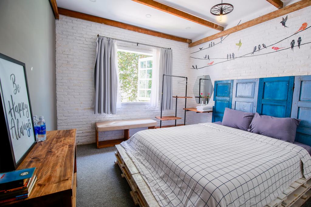Căn phòng nằm ở tầng 3 nhà Little Flower Đà Nẵng, với ban công đầy nắng và gió cực kì thoáng mát. Phòng được thiết kế theo ý tưởng từ bầu trời tự do nằm nghe chim hót và tận hưởng gió trời. Chiếc giường 1m6 chiếm một nửa diện tích căn phòng, bên cạnh đó còn có chiếc ghế nhỏ cạnh cửa sổ dẻ bạn thoải mái hóng gió.