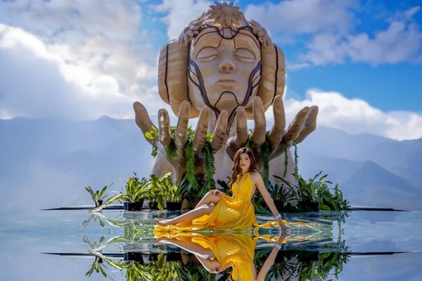 Điểm chụp ảnh với mô hình cổng trời Bali, nữ thần rừng và bàn tay Phật thu hút hàng nghìn du khách tham quan.