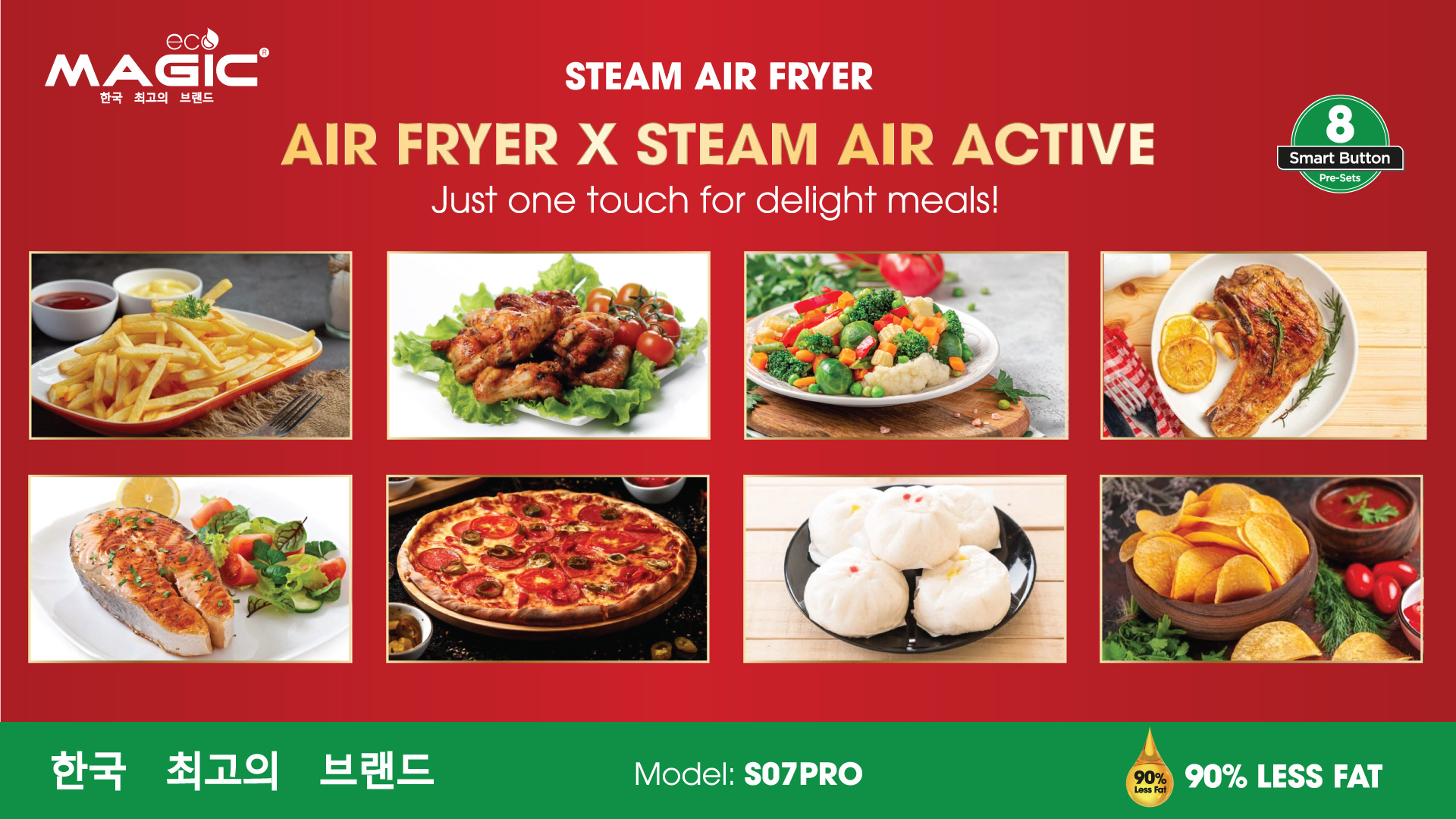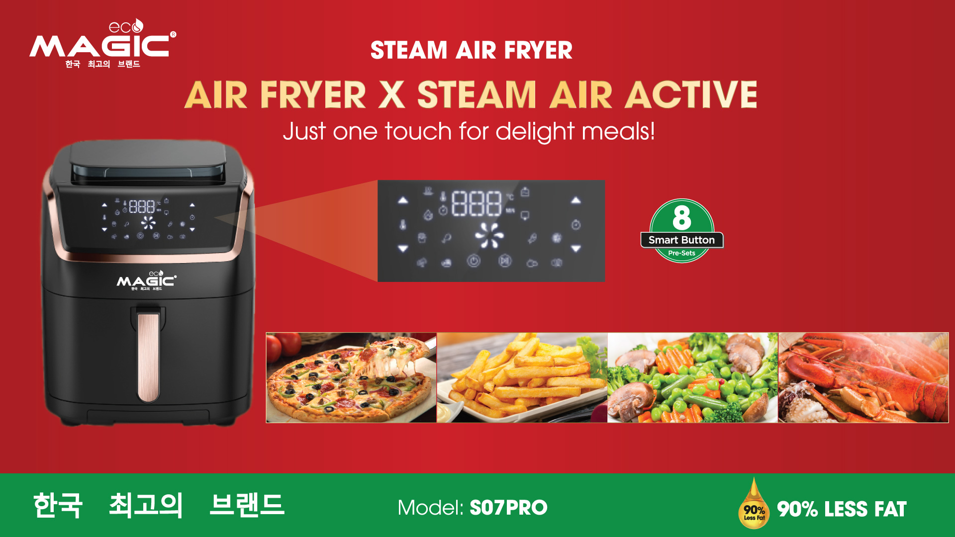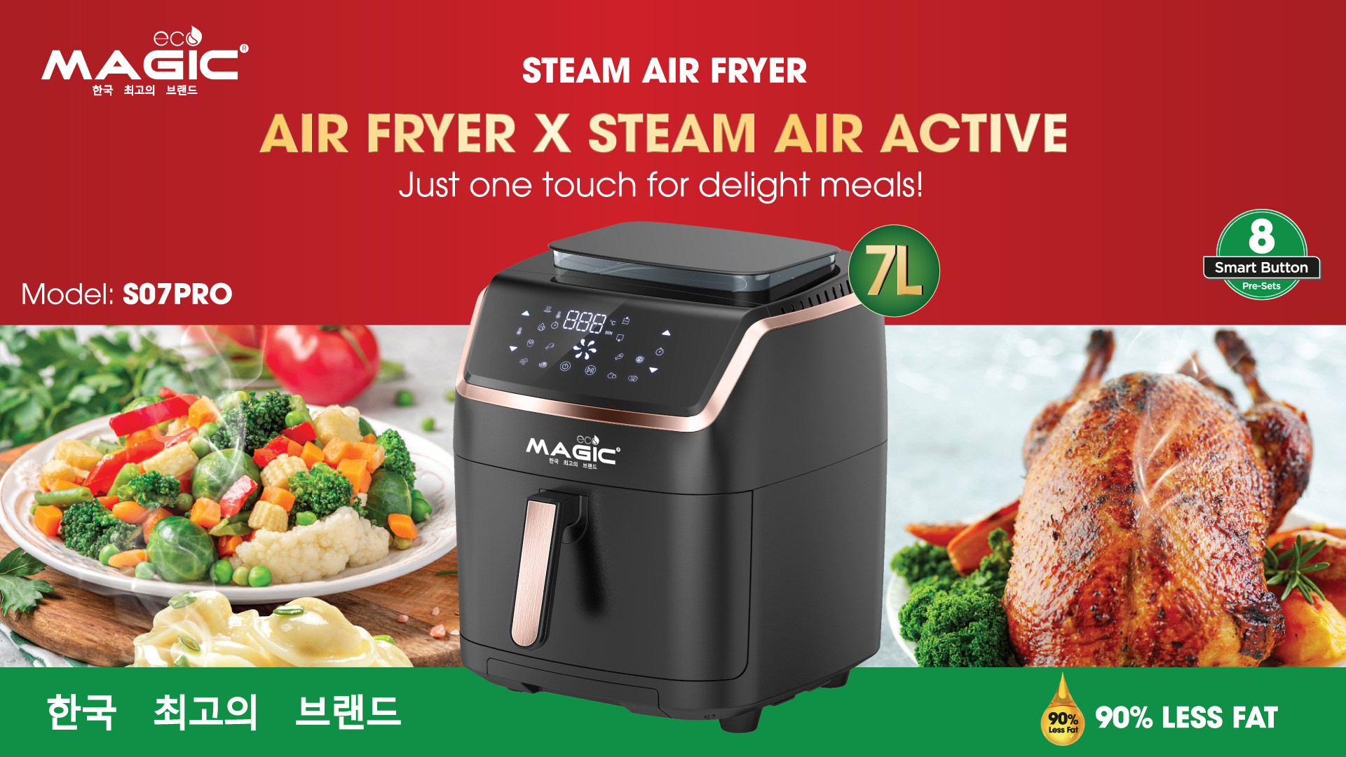Nồi chiên không dầu kết hợp hấp cao cấp Magic Eco S07 Pro là sự kết hợp hoàn hảo giúp đột phá công nghệ nấu năng trong cùng một sản phẩm khi kết hợp giữa Chiên không dầu Rapid Air và hấp siêu nhiệt Steam Air Active.