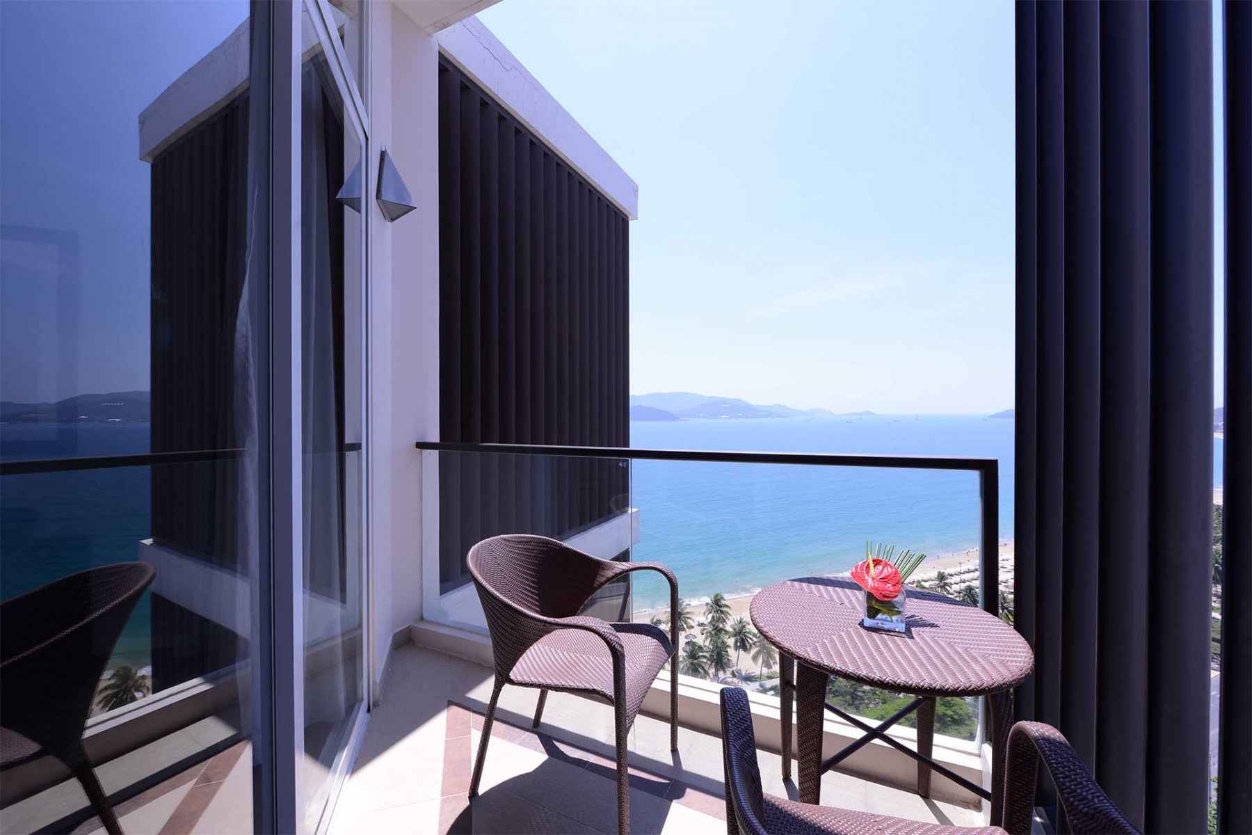 Lối kiến trúc cao tầng, đặc biệt hơn với Cảnh sắc Nha Trang, tất cả các phòng đều được thiết kế có ban công, view ngắm nhìn trực tiếp ra biến, sáng đón nắng sớm, khi chiều tà, ánh hoàng hôn bao trùm cả khách sạn, Khi không ra ngoài buổi chiều bạn vẫn có thể ngồi trên ban công ngắm cảnh chiều nhâm nhi một tách cà phê.