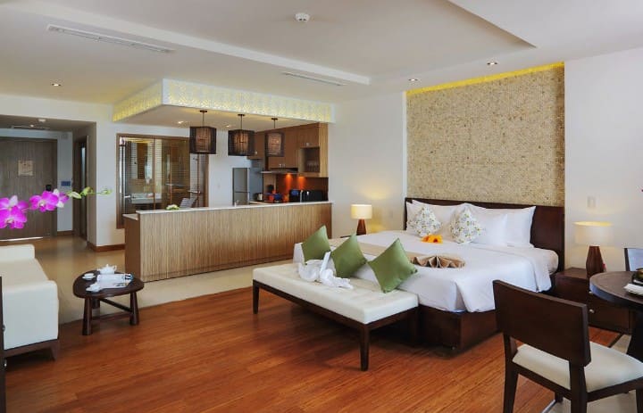- Premium Suite: Số lượng 02 căn. Mỗi căn có diện tích 180m2. Nội thất nổi bật gồm 02 giường đôi, tủ lạnh, phòng tắm, bồn tắm sục, khu vực bếp. Phòng có sức chứa tối đa 04 người. Lưu ý: Hạng Premium Suite có 01 phòng ngủ có cửa ngăn cách và 01 phòng ngủ mở bố trí gần trước biển.