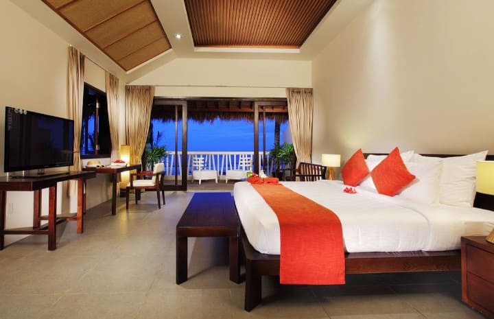- Bungalow Beach Front: Số lượng 04 phòng. Mỗi phòng có diện tích 72m2. Nội thất - tiện nghi nổi bật gồm 2 giường đơn/1 giường đôi, phòng tắm với bồn tắm nằm. Phòng có sức chứa tối đa 02 người.