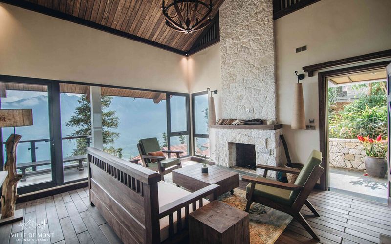 Phải nói, tất cả đồ nội thất đều được "đo ni đóng giày", từ đá tự nhiên, gỗ bản địa màu trầm, đến các hoạ tiết thổ cẩm Sa Pa thô mộc, tinh tế và sang trọng. Lấy ý tưởng từ bếp lò trong căn nhà của người dân tộc bản địa, lò sửa củi ở trung tâm phòng khách giống như "kim chỉ nam" của mỗi buổi trò chuyện, tâm sự. Ngoài trời se se lạnh còn bên trong nhà, người đốt lửa cho củi cháy, người chuẩn bị khoai lang để nướng, người gọt hoa quả bày ra đĩa, người rót chai vang ra từng ly. Xong xuôi đâu đó, tất cả đều ngồi dưới ánh lửa bập bùng, vừa nhâm nhi rượu, vừa đắm mình trong tiếng nhạc indie. Tiếng cười đùa chẳng ngớt, đôi khi cũng chỉ là những cái ôm hay đung đưa vai nhè nhẹ đắm mình vào bầu không khí thân mật…